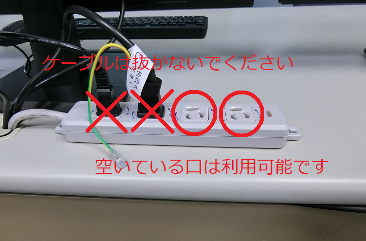 卓上に利用可能な電源タップを設置しています。空いている口があるので充電やノートPCの使用時にはこちらを利用してください。ただし、持ち込み機器を使用する際には必要がなければツイストロックはしないでご利用ください。海外製品などでプラグの根本が弱いものがあり、ロックが外れずにプラグが抜けなくなった事例が複数発生しています。外す際に結果的に機器を破壊しています。