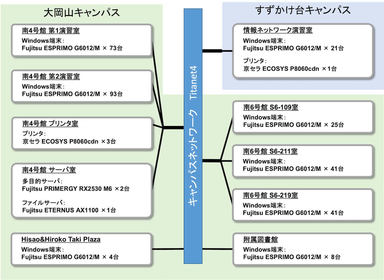 | 場所 | 端末 | プリンタ | 教員用端末 | 授業利用 |